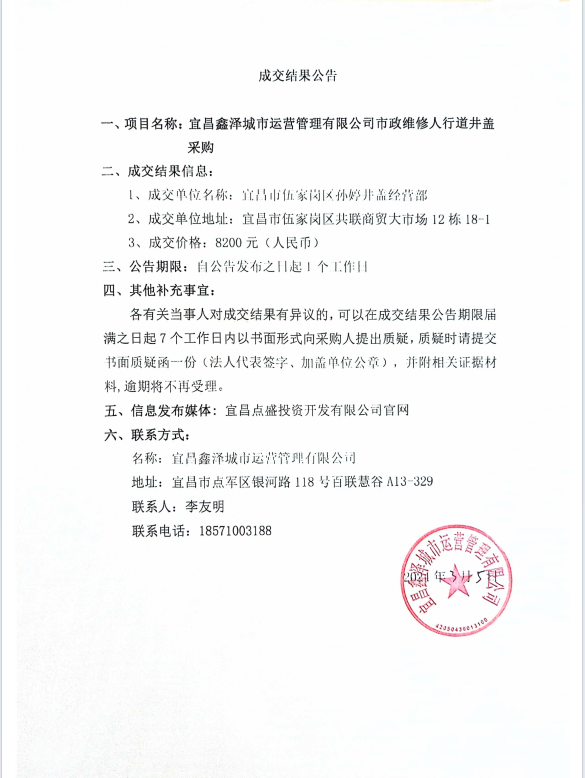 宜昌鑫澤城市運(yùn)營管理有限公司市政維修人行道井蓋采購項(xiàng)目成交公告