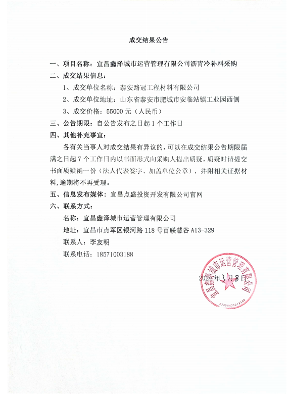 宜昌鑫澤城市運(yùn)營管理有限公司瀝青冷補(bǔ)料采購項(xiàng)目成交公告