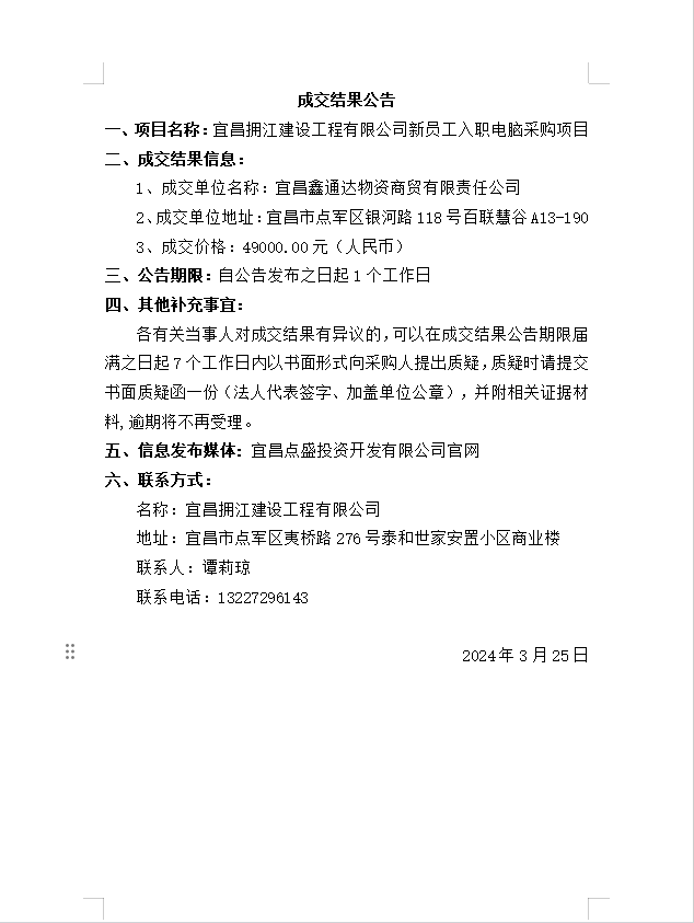 宜昌擁江建設(shè)工程有限公司新員工入職電腦采購項(xiàng)目成交公告