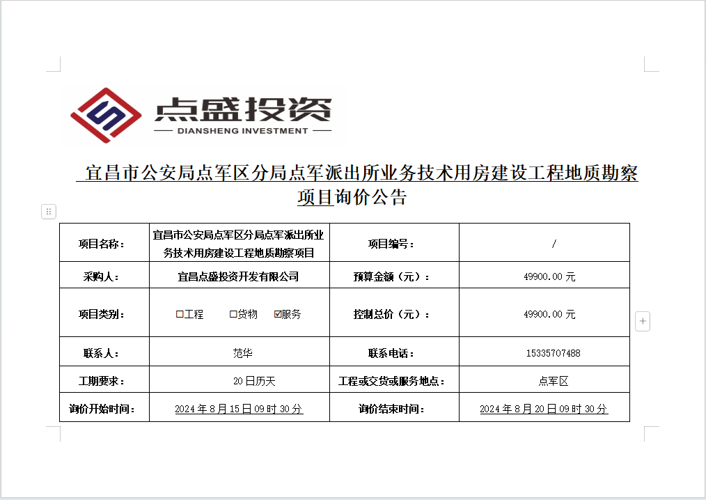 宜昌市公安局點軍區(qū)分局點軍派出所業(yè)務(wù)技術(shù)用房建設(shè)工程地質(zhì)勘察項目詢價公告