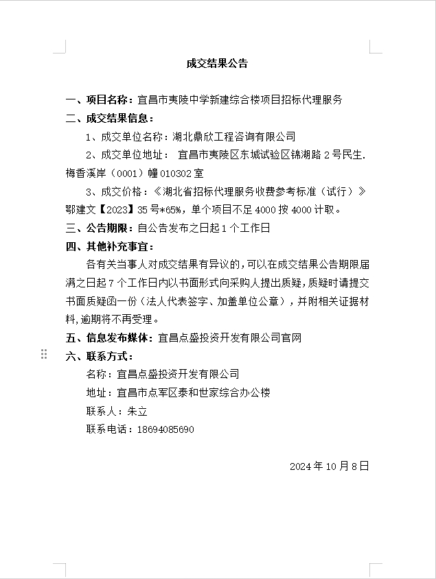 宜昌市夷陵中學(xué)新建綜合樓項目招標(biāo)代理服務(wù)成交公告