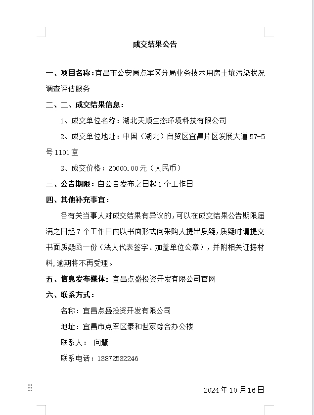 宜昌市公安局點(diǎn)軍區(qū)分局業(yè)務(wù)技術(shù)用房土壤污染狀況調(diào)查評估服務(wù)成交公告