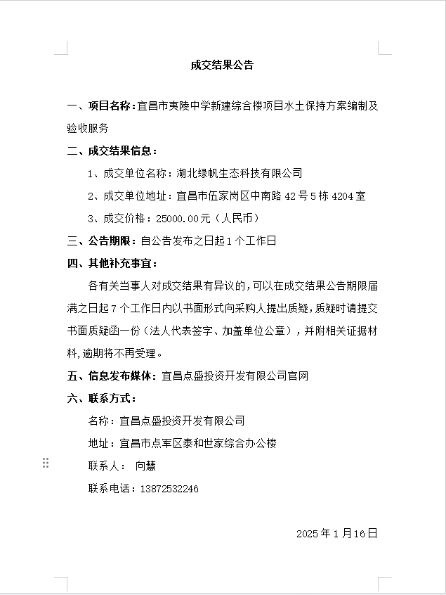宜昌市夷陵中學新建綜合樓項目水土保持方案編制及驗收服務成交公告